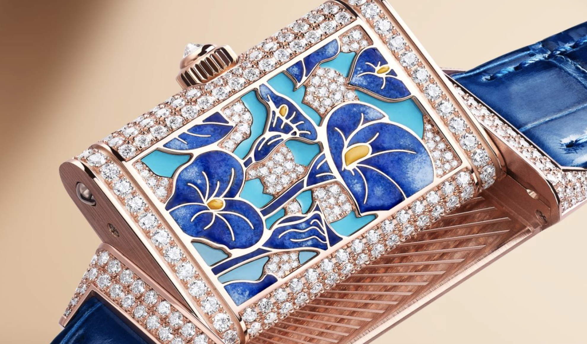 JAEGER-LECOULTRE积家推出两款全新Reverso One Precious Flowers翻转系列珍稀花卉腕表,分别采用蓝色及海沫绿色为主色调。 从风靡20世纪20年代的装饰性珠宝作品中汲取灵感,赞颂娇艳花朵流露的浪漫诗意,采用玫瑰金打造。全新时计搭配色彩鲜艳的亮面鳄鱼皮表带,搭载Jaeger-LeCoultre积家846型手动上链机芯。每款腕表仅限量推出10枚,因此每枚腕表作品上的微绘图案皆独一无二,