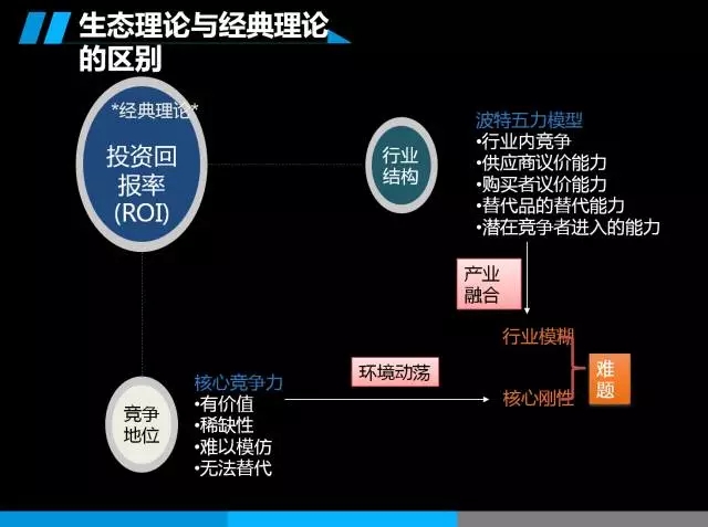 在经典理论里面,我们经常从两个视角思考企业的投资回报率问题,第一个行业的结构,第二个讲企业竞争优势。企业的投资回报率应该是行业平均回报和企业竞争因素的函数。行业平均回报率是被行业决定的,就是金融壁垒,行业竞争等等波特五力模型的因素。第二个是企业竞争优势,是相对同类型的竞争对手,你的竞争优势在哪。从这个角度思考什么是生态:一个企业要实现更高的回报,一种可能是改善行业结构,如何优化行业结构,以至于行业整体回报非常高。第二个竞争优势,能够比其他企业来得更加持久。