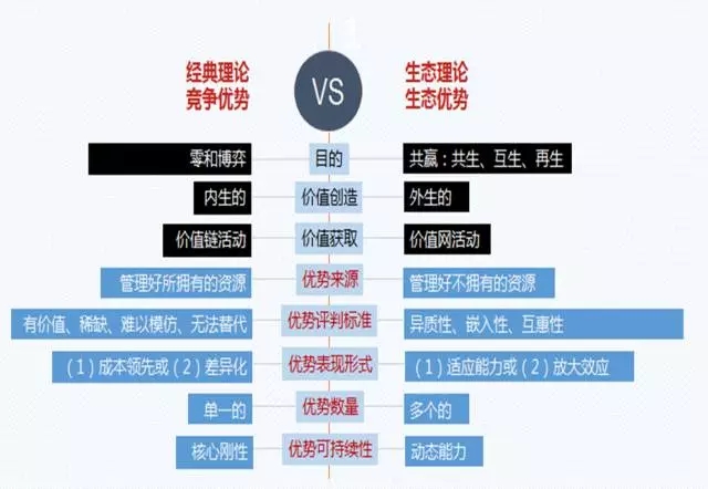 从这里看,我觉得生态和竞争有几个非常重要的不同点,第一个竞争讲的核心点,如何管理好你所拥有的资源,你希望在你管理好拥有的资源里面形成你的竞争优势,生态优势来自于你不拥有的资源。第二个,竞争优势来自于你的价值链,而生态优势来自于你的价值网。第三个,竞争优势来自于某一个某方面的竞争优势,最终导致我们说的竞争刚性,你原来拥有的竞争优势随着行业变化会变成你的竞争劣势,而生态优势来自于多方面的优势,生态优势是多方不同的耦合,以至于他对环境的应对更快。