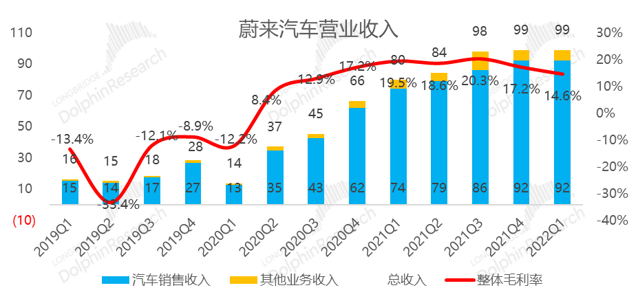 1、收入平平:之前公司一季度指引疲软,但实际结果也就是在指引和预期之内,但季度收入99亿。其中由于单车价格拉胯的程度没有想象的那么严重,在销量明确的情况下,汽车销售的收入反而小超预期,但是电池升级服务收入这个季度太差,导致汽车销售之外的其他收入明显拉胯,最终也就是平平的收入表现。
