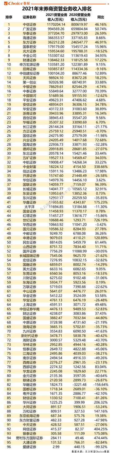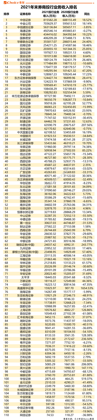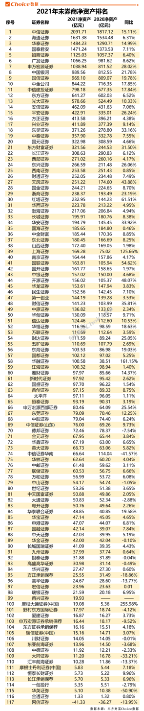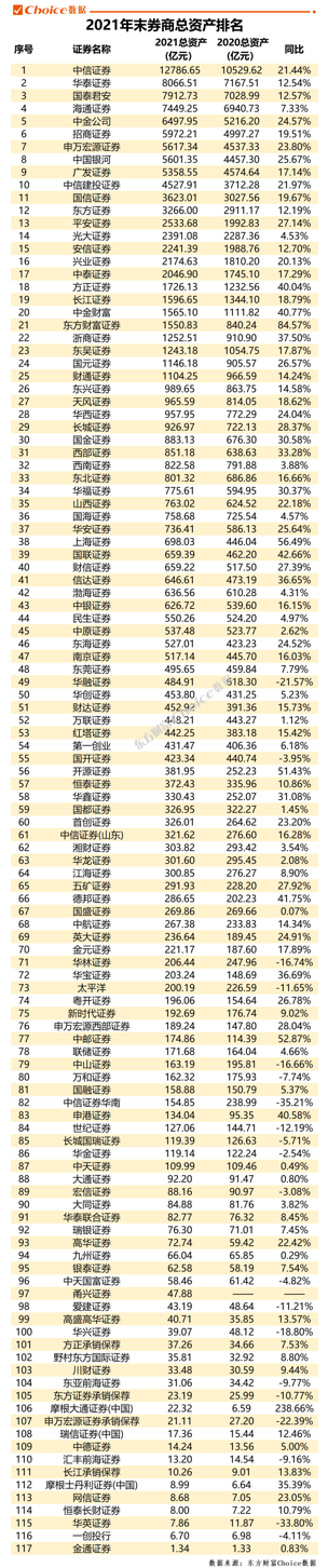 近日,东方财富Choice数据通过对证券业协会中收录的券商2021年财务报告合并整理,汇总出百大券商规模及经营业绩排名。