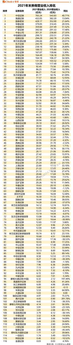 中信证券营收约765.24亿元,排名第一;海通证券、国泰君安和华泰证券位居2-4位。年度收入超过百亿元的有18家证券公司,与2020年持平;收入在10-100亿元的共66家,比2020年增加5家。