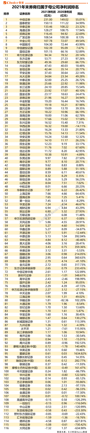 中信证券以231亿元居于榜首,归母净利润超百亿的券商共10家,还包括国泰君安、华泰证券、海通证券、招商证券、广发证券、中金公司、中国银河、中信建投证券和国信证券。