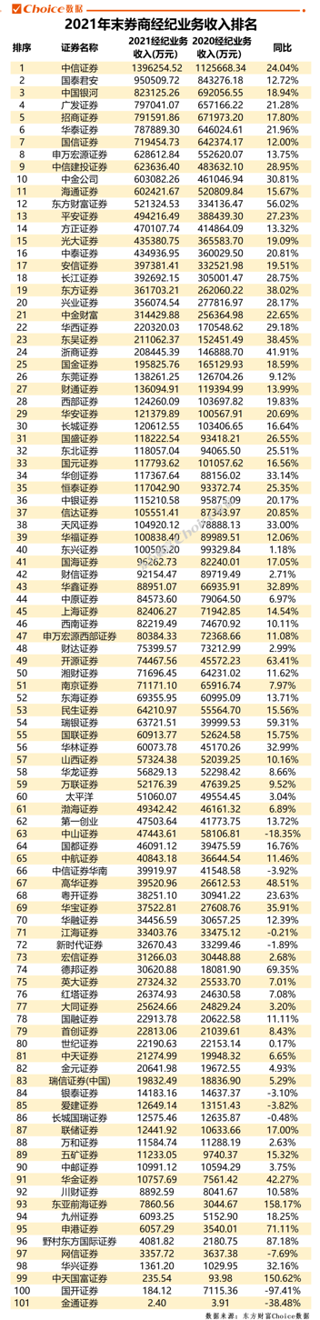 其中,中信证券以139.63亿元的经纪业务收入位居第一,同比2020年增长24.04%。