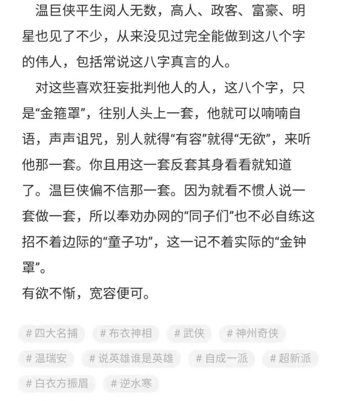 况且,温瑞安还有“坑王”的称号。自在1996年写出《说英雄》系列的第八部《天下无敌》之后,温瑞安就没有新作问世。目前这两个系列都没有完结,主要角色中为数不多尘埃落定的,只有苏梦枕和白愁飞的死亡。甚至此次引起争议的剧情中,强暴雷纯的蒙面人真身究竟是谁,至今还是一桩“破板门疑案”。