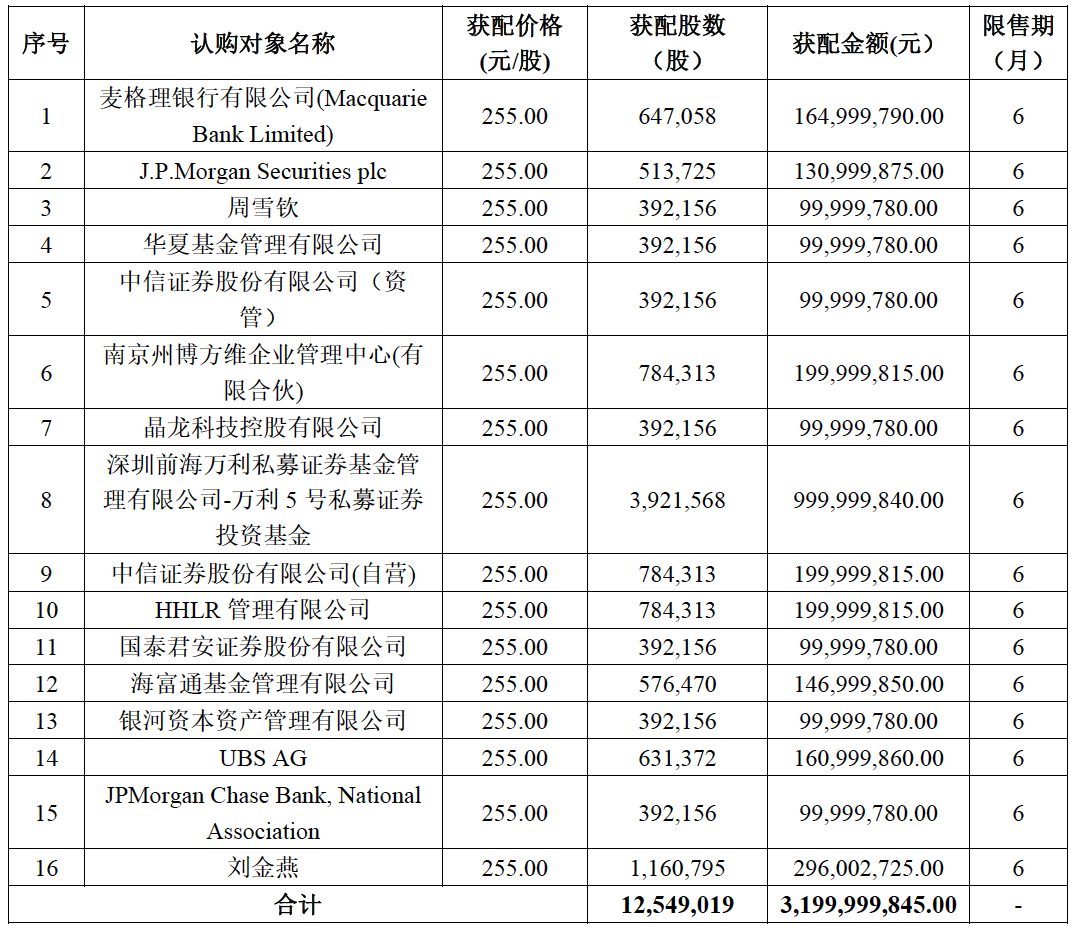 最终确定的16名认购对象中,不乏多家知名资管机构。其中,高瓴旗下HHLR管理有限公司获配2亿元、前海万利私募基金获配10亿元、中信证券股份有限公司(自营)获配2亿元,及摩根大通、华夏、海富通基金,瑞银集团等均参与。