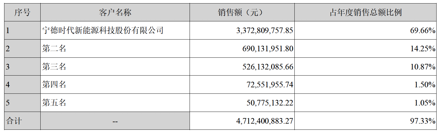 德方纳米称,其与宁德时代(300750.SZ)、亿纬锂能(300014.SZ)、比亚迪(002594.SZ)等锂离子电池行业企业形成长期合作关系。年报显示,2021年,宁德时代以33.73亿元销售额占据德方纳米第一大客户之位,占德方纳米销售总额的69.66%,可见德方纳米业务上高度依赖宁德时代。