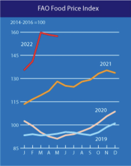 粮农组织食品价格指数(FFPI)已接近历史最高点。一些主食的价格在过去一年中出现了大幅上涨。而农业部门面临着因投入成本上涨而导致的供应限制,特别是化肥和燃料,这可能刺激食品价格进一步上涨。