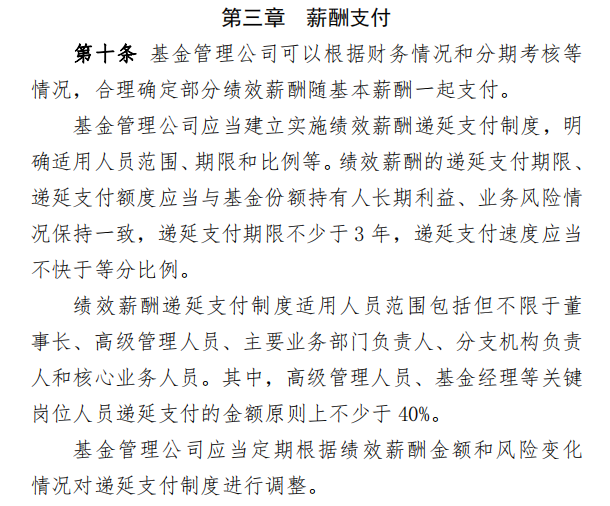 “我们公司上周刚刚公布了绩效和薪酬改革的方案,基本上和这个《指引》中的规定一致。高管和基金经理的绩效和薪酬需要递延3年支付,第一年发50%、第二年发30%、第三年发20%。”深圳某资管规模在千亿元的基金公司内部人士向记者透露。