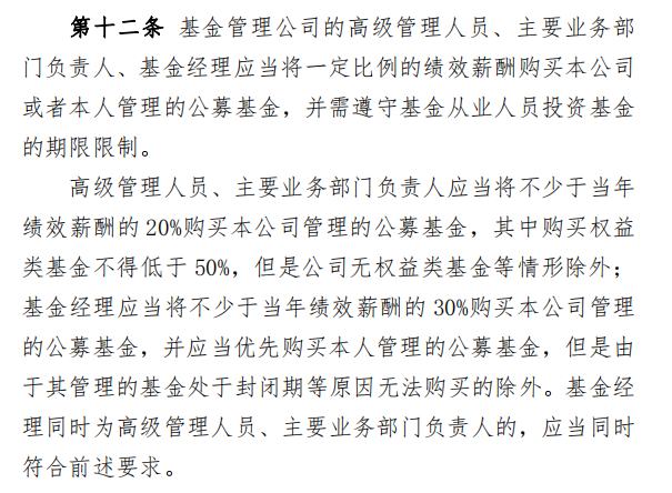 《指引》提到,要注重发挥长效激励约束机制作用,有利于保护基金份额持有人的利益。其中规定高级管理人员、主要业务部门负责人应当将不少于当年绩效薪酬的20%购买本公司管理的公募基金,其中购买权益类基金不得低于50%;基金经理应当将不少于当年绩效薪酬的30%购买本公司管理的公募基金,并应当优先购买本人管理的公募基金,实现公司高级管理人员、主要业务部门负责人、基金经理利益与持有人利益的绑定,更好激励约束相关人员的行为。