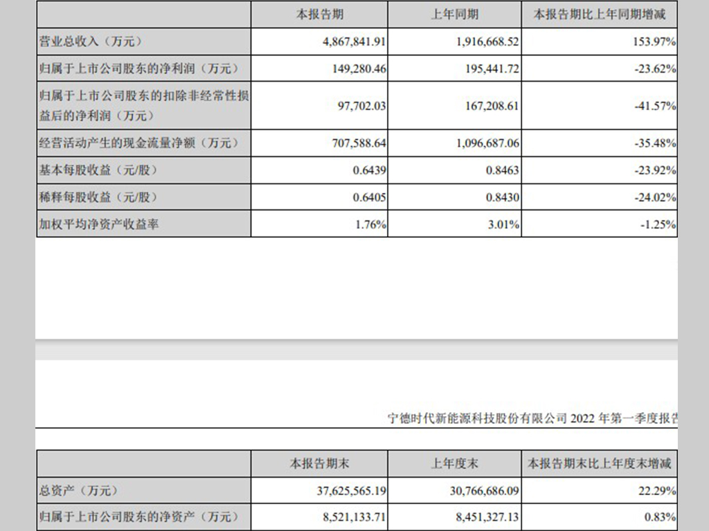 至于宁德时代,随着2022年第一季度财报的发布,同比下降23.62%的归母净利润引发了不少关注和讨论。宁德时代不及预期的表现,让“宁王”的股价又出现了明显的下跌。