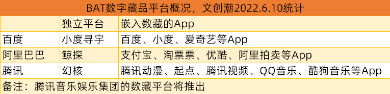 文创潮注意到,目前BAT等大平台均已入局数字藏品,多采取独立商城与大用户量App嵌入两种方式相结合。