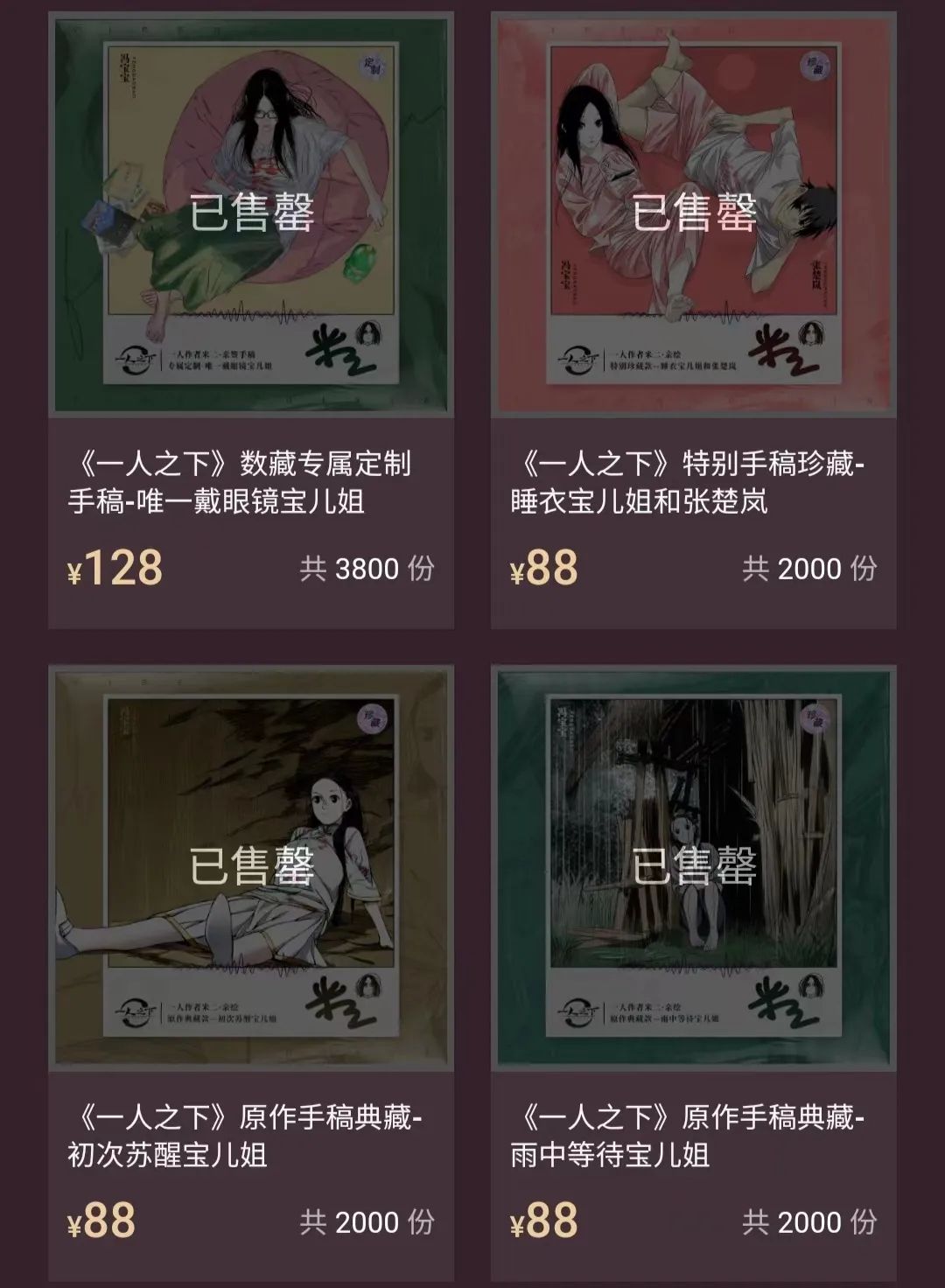 其中,最先被抢光的是“《一人之下》特别手稿珍藏-睡衣宝儿姐和张楚岚”,其他三款随后也陆续售罄。按官网资料计算,此次销售额超百万元。