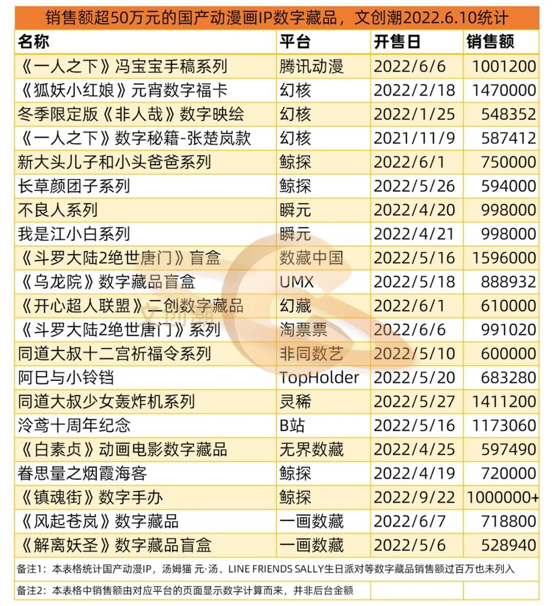 虽然,销售额过百万元的数字藏品时有出现,但文创潮观察市场上数百个数字藏品平台后发现:当前,动漫IP并非数字藏品的主流品类,大多数动漫IP的数字藏品销售额并不高,在数万到二三十万之间。