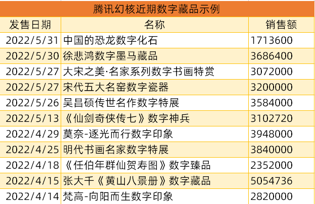 比如四月和五月,幻核平台上的徐悲鸿数字墨马藏品、大宋之美·名家系列数字书画特赏、宋代五大名窑数字瓷器、吴昌硕传世名作数字特展、《仙剑奇侠传七》数字神兵、莫奈-逐光而行数字印象、明代书画名家数字特展等销售额都超过了300万元。