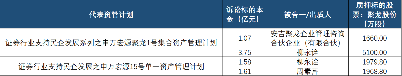 从诉讼双方来看,原告为申万宏源证券,代表旗下两只资管计划,分别为证券行业支持民企发展系列之申万宏源聚龙1号集合资产管理计划(简称“申万宏源聚龙1号”)和证券行业支持民企发展之申万宏源15号单一资产管理计划(简称“申万宏源15号”)。