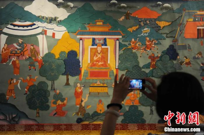 手绘大型历史题材卷轴唐卡《凉州会盟》。中新社记者 杨艳敏 摄