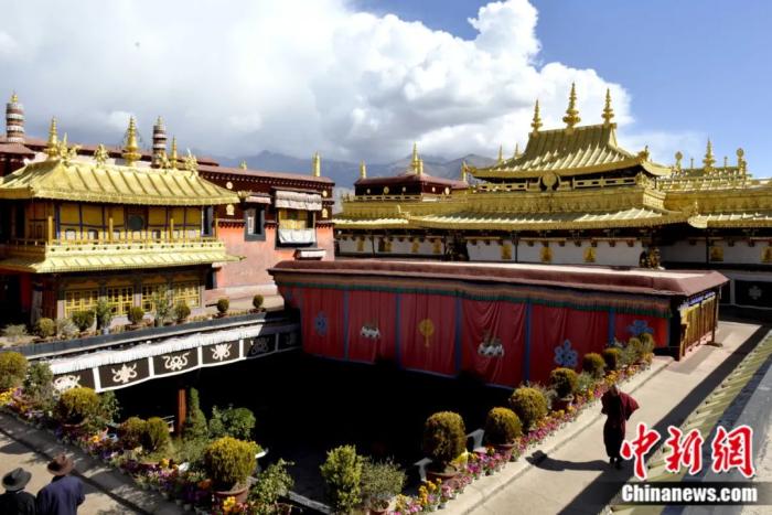 2014年10月拍摄的大昭寺金顶。大昭寺是西藏重大佛事活动的中心,“噶厦”政府的机构设于寺内。许多重大的政治、宗教活动,如“金瓶掣签”等都在这里进行。中新社记者 李林 摄