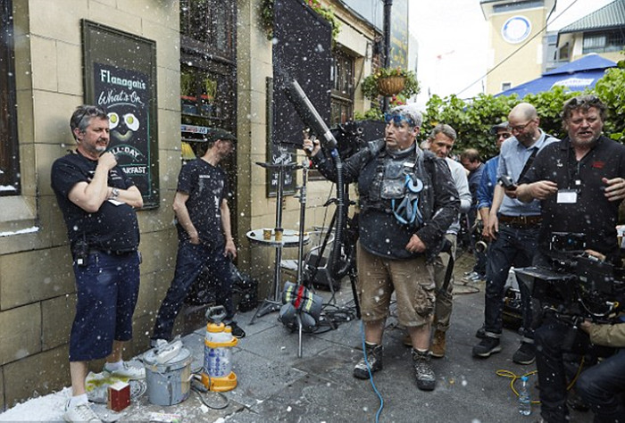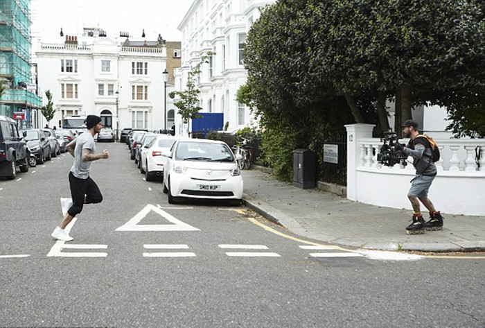 说到天气状况,晴朗的天气下为了拍摄,也特意用消防车和制雪机来制造下雨天和下雪天的场景,另外还有一个踩着轮滑的摄影师来跟拍运动中的贝克汉姆。