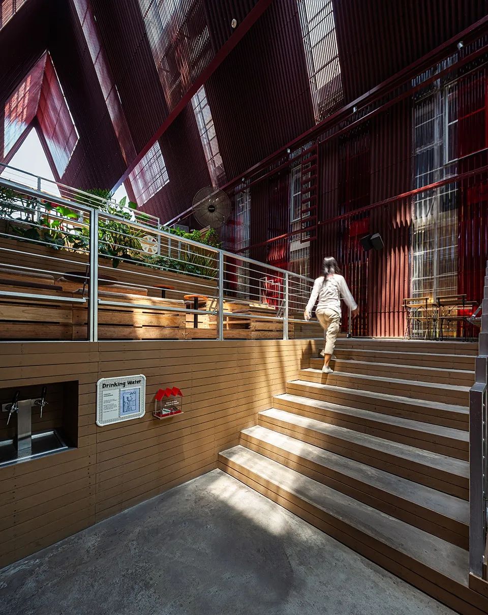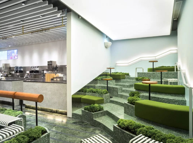 街角的商铺立面和社交楼梯将乏味的空间转变为充满活力的、对数字社交友好的空间,撞色与软包椅座,体现人文的同时也散发着浓浓的工业美学。