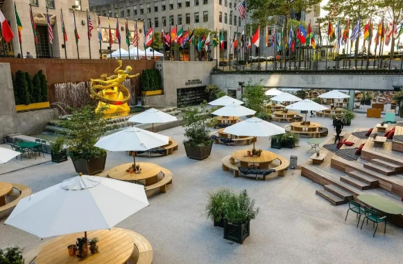 搭配下沉庭院的上方高低错落的四顶巨大透明的“阳伞”,不但能够起到遮蔽风雨的作用,也形成了一个集购物、休闲、社交为一体的开放场所空间,作为商业的小型表演、创意市集等文创活动使用。