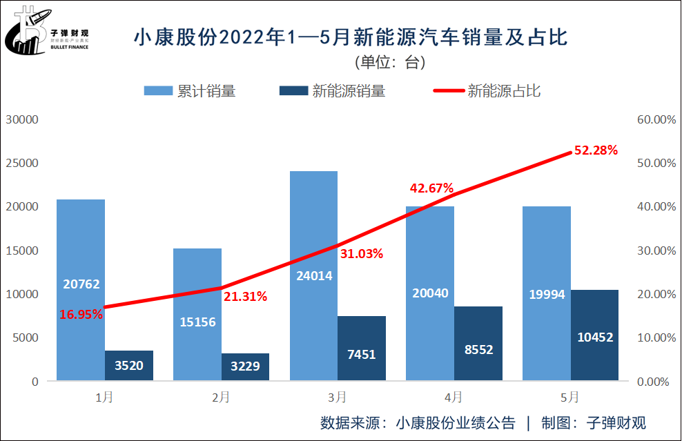 从前5个月整体来看,小康累计实现汽车产量102557台,同比下降14.90%。累计实现汽车销量99966台,同比下降10.31%,其中,新能源汽车累计销售33204台,同比增长212.33%,占总销量的33.22%。