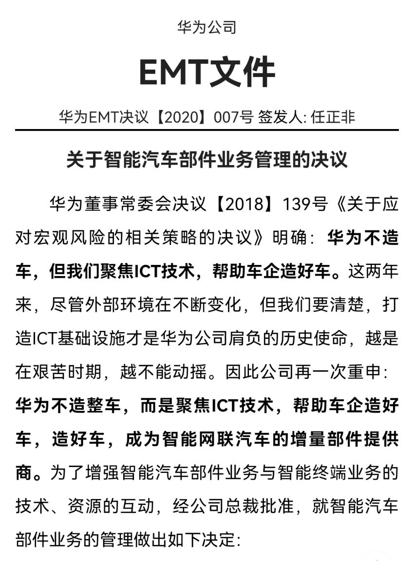 在2020年11月,华为的一则关于智能汽车业务的人事任命引起了业界的关注,业界在质疑华为造车的同时小康遭资本市场疯抢。为此,华为在11月25日公开的一份内部签发决议中再次声明:华为不造整车,而是聚焦ICT技术,帮助车企造好车,成为智能网联汽车的增量部件提供商。