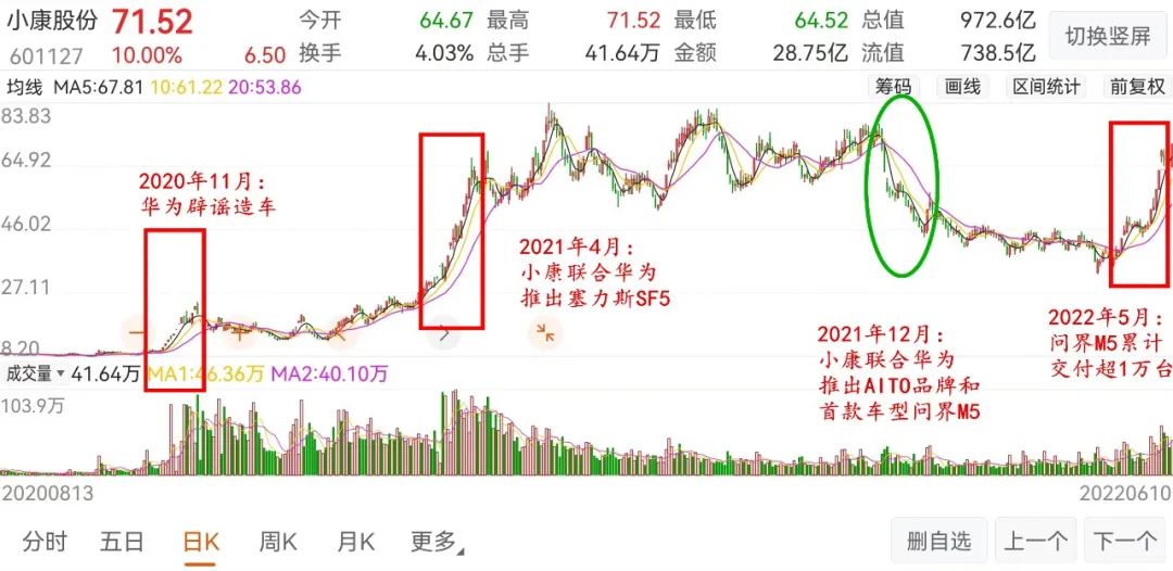 很难想象,一个上市五年的三线车企,勤勤恳恳地造车卖车股价从40元跌破10元,市值一度跌至不到100亿。而在同华为合作造车后,仅只用了不到半年时间让小康的股价重回巅峰,市值冲破1000亿大关。