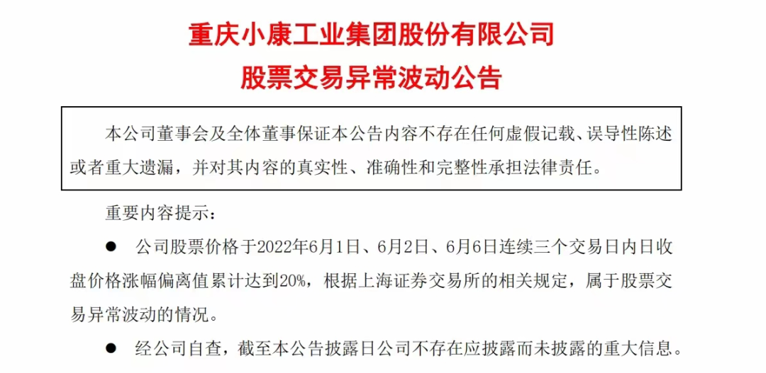 6月7日,在连续三个涨停板后,小康对外发布了一份“股票交易异常波动公告”。公告称,小康股价于2022年6月1日、2日和6日的连续三个交易日内,收盘价格累计涨幅达到20%。而根据上交所的规定,小康的股价大涨属于“异常波动”。