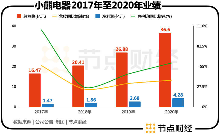 2017年至2020年,四年间,营收、净利润迎来持续高增长的小熊电器,在2021年突遭腰斩背后,更多是整个行业下滑所致。