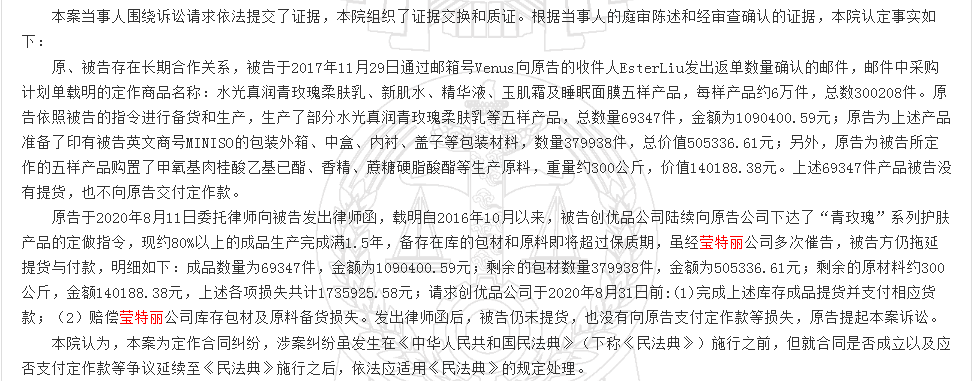 根据莹特丽科技、名创优品(广州)有限责任公司定作合同纠纷民事判决书:原、被告存在长期合作关系,被告于2017年11月29日通过邮件向原告下达水光真润青玫瑰柔肤乳、新肌水、精华液、玉肌霜及睡眠面膜产品的定做指令,每种产品约6万件。原告依照被告的指令进行备货和生产,后被告不予提货亦不支付货款,经原告催告仍不予履行。