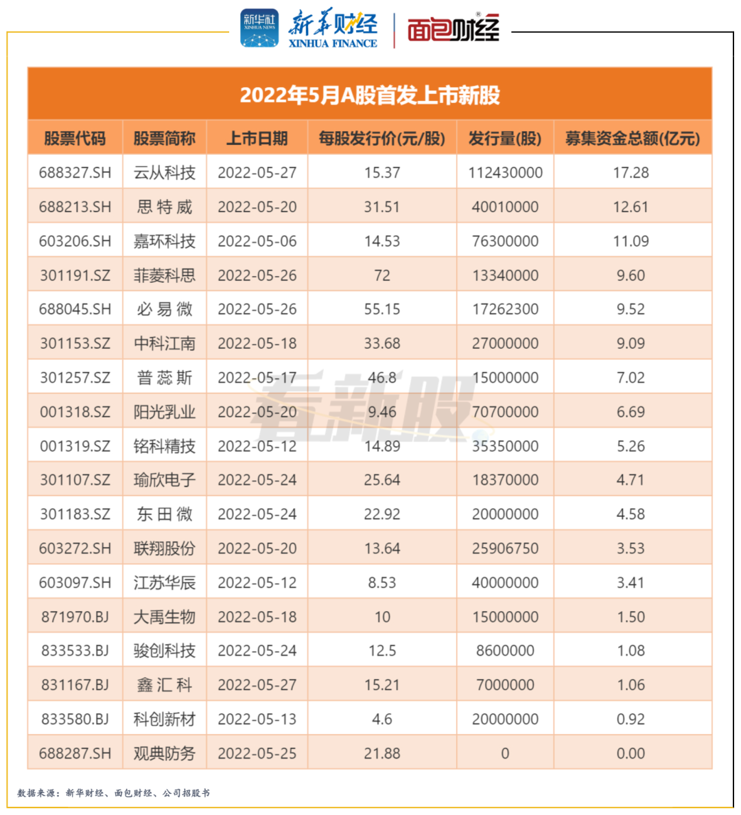 2022年5日,A股市场共有18只新股上市,环比下降18只,募集资金合计108.96亿元,环比降超八成。其中,云从科技首发上市的募资总额达17.28亿元,为当月募资规模最高的新股。