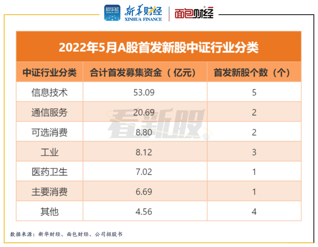 此外,按照中证行业一级行业分类,2022年5月,云从科技、思特威等5只新股属于信息技术行业,合计首发募集资金总额达53.09亿元。嘉环科技和菲菱科思属于通信服务行业,合计首发募集资金超过20亿元。