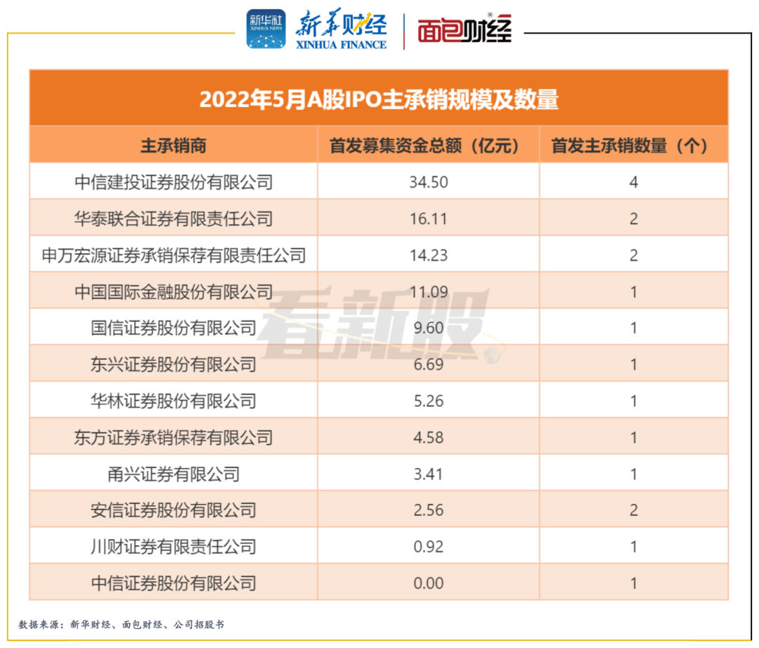 2022年5月,在首发上市的18只新股中,中信建投主承销4个项目,合计首发募集资金总额34.5亿元,为当期主承销A股IPO项目数量和金额规模最高的券商。