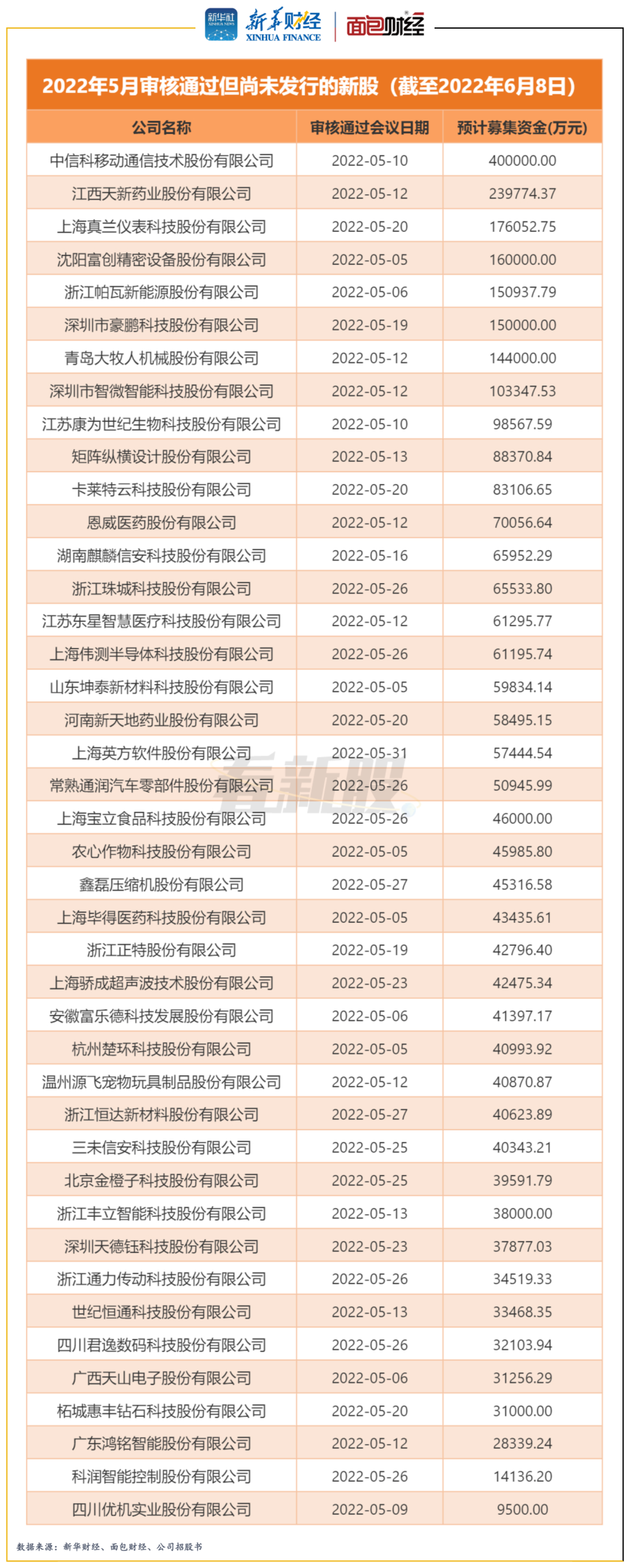 截至2022年6月8日,A股市场共有42家公司已通过审核,但尚未完成发行。其中,中信科移动通信技术股份有限公司于2022年5月10日通过审核会议,预计募集资金40亿元,为当期募资规模最高的待发行新股。