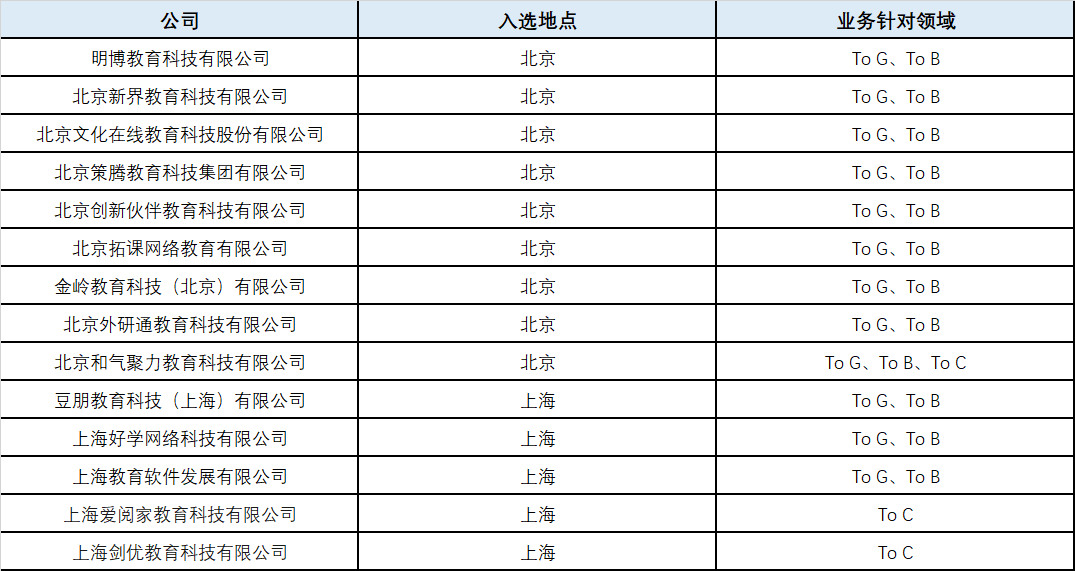 例如此次入选的新东方子公司“布局未来”,去年6月北其注资5000万元成立了东方创科,提出面向B端和G端提供科技创新教育的一揽子解决方案,另外布局未来在今年年初时还注资成立了一家芯片制造公司。亿度慧达则是好未来的高新技术主体之一,运营着教育信息与资源共享平台家长帮App。京版芳草教育则是北京出版集团旗下的企业,其主营业务可以理解为向幼托阶段机构提供素质教育的课程与服务。