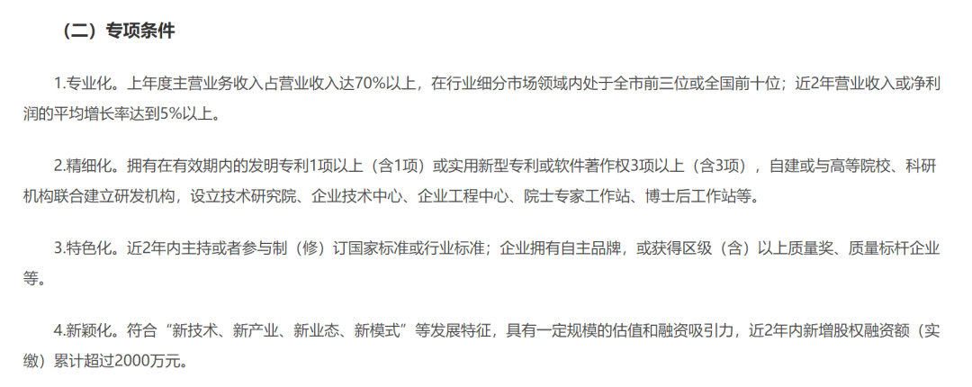 各地入选“专精特新”的标准虽不甚相同,但方向却大致类似,即不仅考虑公司营收、利润、融资、估值等基础财务指标,还要求已获授权的知识产权数量、市场知名度等“科技指标”。