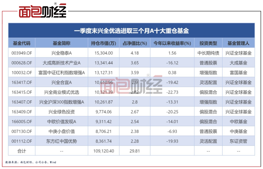 图3:一季度末兴全优选进取三个月A十大重仓基金