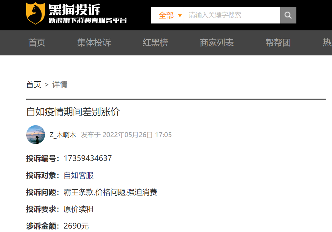对此,自如方面称,由于业主新合约、市场供求显著上涨导致租金上涨。用自如管家的原话来回答:“这个价格是系统自动生成的,是系统自动根据周边房价调整后的价格。”这样的说法,自如租客们显然不满意。新浪旗下消费者投诉平台黑猫投诉上显示,租客对自如的涨价投诉几乎是每周都有新发现,“续租按涨价价格来”“霸王条款涨价”“一周涨价”“强迫消费”等投诉应接不暇。