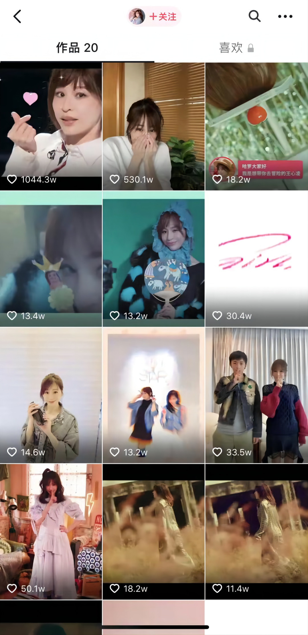 目前“王心凌”账号的视频一共也只有20条,5月之后的作品最高有1000万的点赞,但在这之前,绝大部分作品只有十万、几十万的点赞。