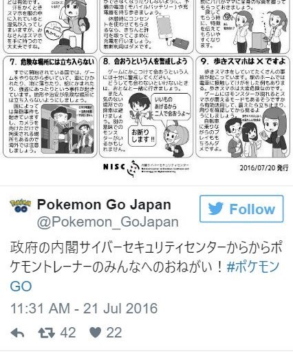 不过游戏还没开服,日本政府却已经先方为敬了。满大街由于《Pokemon GO》引发的交通事故和犯罪事件,真在日本开服了可咋办?7月20日,日本网络安全局赶快趁着《Pokemon GO》还没开服,在Twitter公布了一个《Pokemon GO》安全指南。除了不要泄露个人信息和不要到危险地点去之外,安全指南还提醒大家要记得不要随便见网友,以及出门带上充电宝。