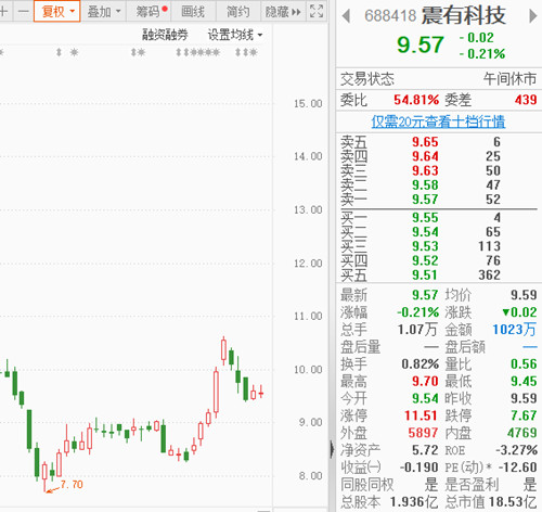 6月13日收盘,震有科技(688418.SZ)收于9.46元/股(-1.36%),今年以来累计下跌37.68%。