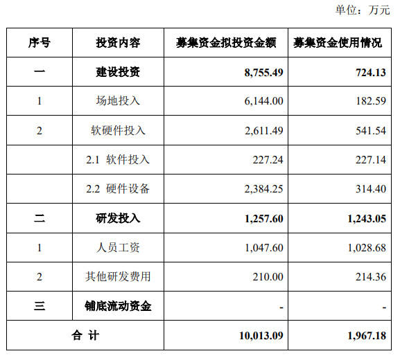 截至2022年5月25日,募投项目“产品研究开发中心建设项目”已投入1,967.18万元,投资进度为19.65%,其中大部分支出为研发投入的“人员工资”,募资拟投资1,047.60万元,实际使用了1,028.68万元;其他研发费用拟投资210万元,实际为214.36万元,超出计划金额。在建设投资中,除了软件投入完成预定投资额之外,其余投资进度均较低。
