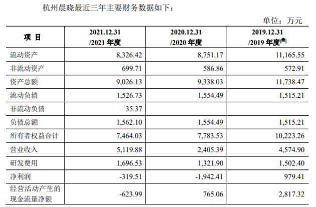 杭州晨晓主要提供光通信设备和解决方案,但区别于传统制造企业,以研发为主,其生产环节相对简单且主要是外包,资产规模较小且以流动资产为主。2019年以来,杭州晨晓营业收入出现大幅波动,净利润已连续亏损两年,2020年和2021年两年净利润累计亏损2,261.92万元,此前2019年赚得的净利润由此悉数亏完。