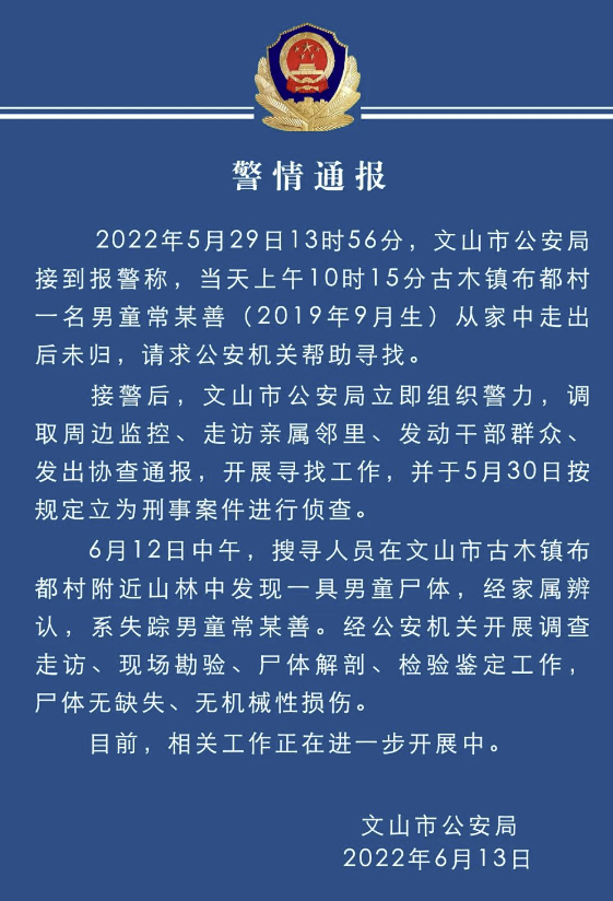 6月12日中午,搜寻人员在文山市古木镇布都村附近山林中发现一具男童尸体,经家属辨认,系失踪男童常某善。经公安机关开展调查走访、现场勘验、尸体解剖、检验鉴定工作,尸体无缺失、无机械性损伤。