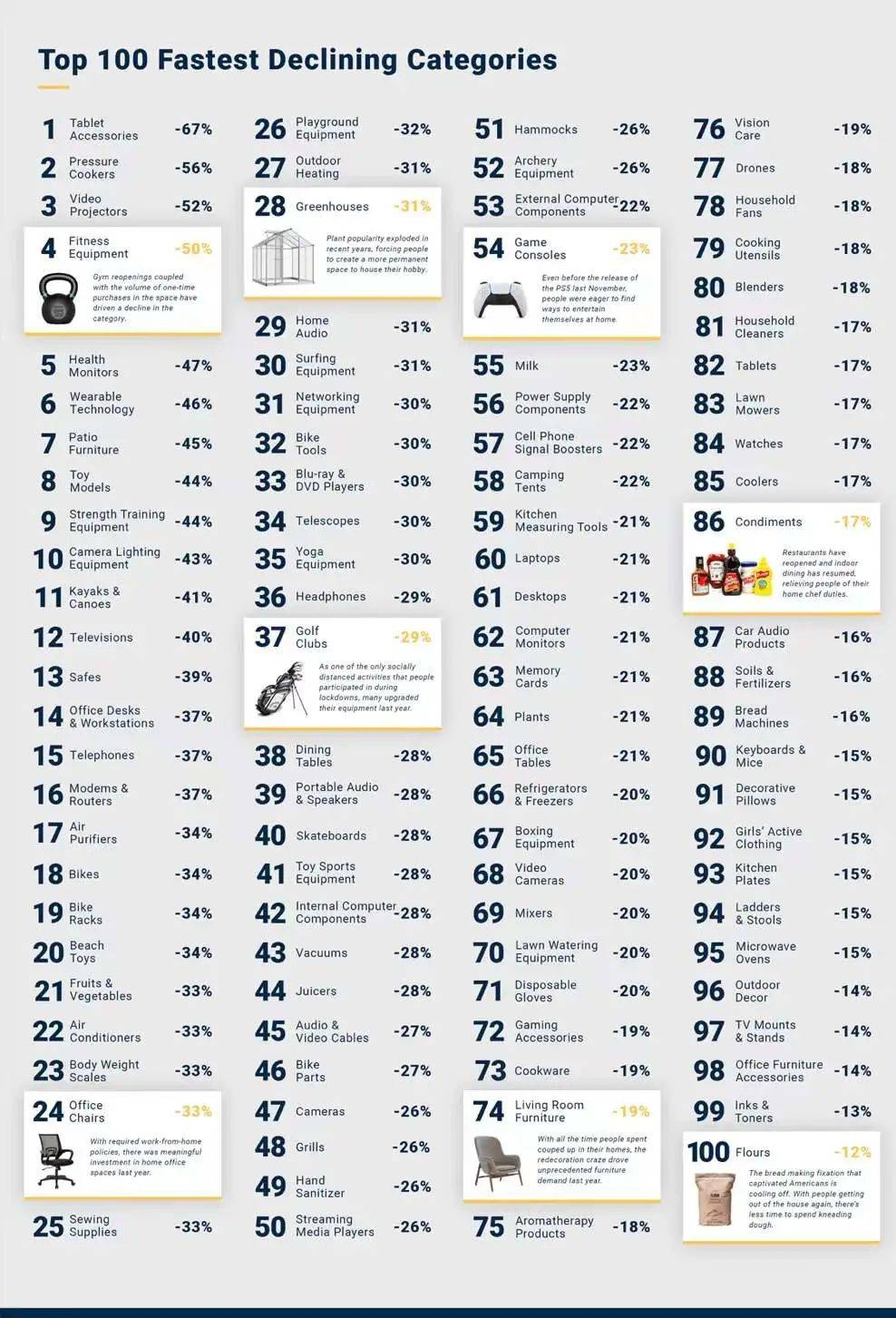 但所谓“皮之不存毛将焉附”,过去几年消费电子产品的整体增速并不乐观。美国零售业调查公司Stackline发布的2020-2021年美国电商增长最快和下降最快的100个类目显示,平板电脑配件是下降最快的类目,同比下降了67%。