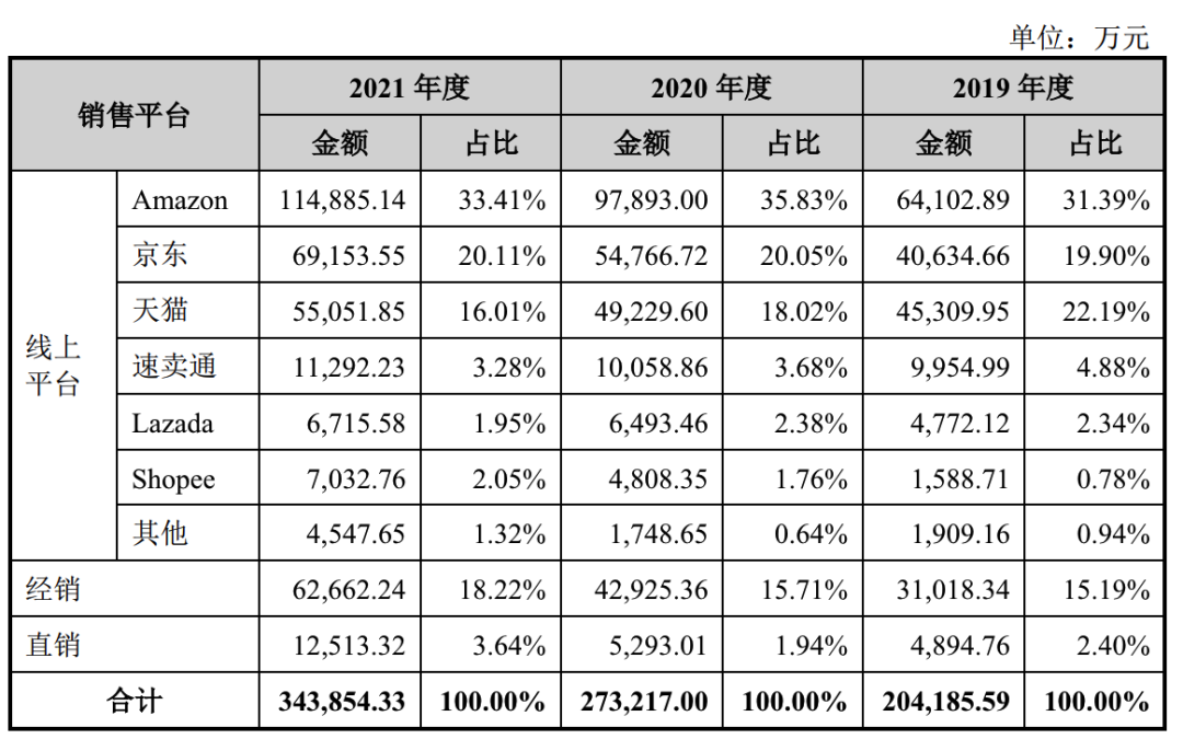 事实上,即使到今天,亚马逊都是绿联的主要销售渠道之一。招股书显示,2019年-2021年,绿联来自亚马云的营收金额分别为6.41亿元、9.78亿元和11.49亿元,占营收的比重分别为31.39%、35.83%和33.41%。