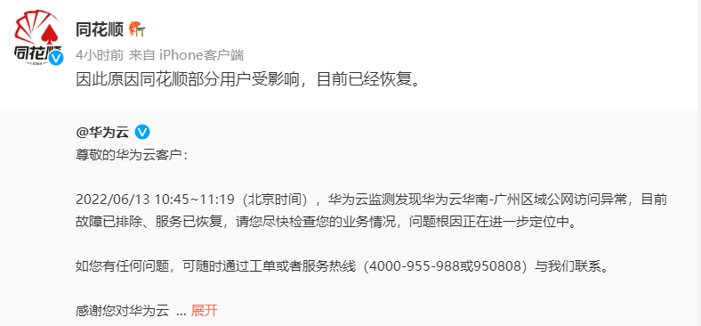 事实上,就在同花顺发布该声明不久之前,华为云官微发布客户通知称,6月13日10:45至11:19,华为云监测发现华为云华南-广州区域公网访问异常,可能影响您相关云服务的访问,目前该故障已恢复,请您尽快检查您的业务情况,问题根因正在进一步定位中。