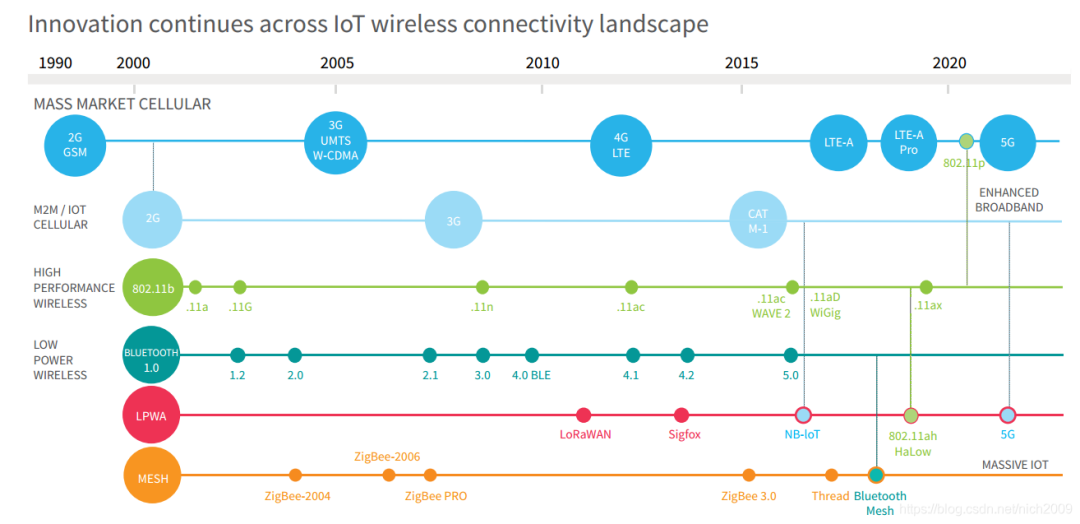 从 IHS Markit 对现有主流无线连接技术的梳理来看,有关无线连接的研究从上世纪九十年代便开始了。其中典型的代表是蜂窝网络,从起初的2G网络逐步演变成现在的5G网络;其次是WiFi技术,从最开始的802.11b标准发展到如今的802.11p标准,这些在一些局域传输产品都有应用;再是蓝牙技术,在过去几十年里不断进化;然后是LPWA通信技术,它的出现时间相对较晚,主要针对广域无线连接的产品;最后是Mesh技术,不同于之前点对点的结构,它形成了一个类似多节点的网状结构,能极大提升传输效率。