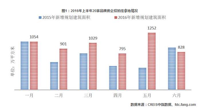 图1:2016年上半年20家品牌房企招拍挂拿地情况